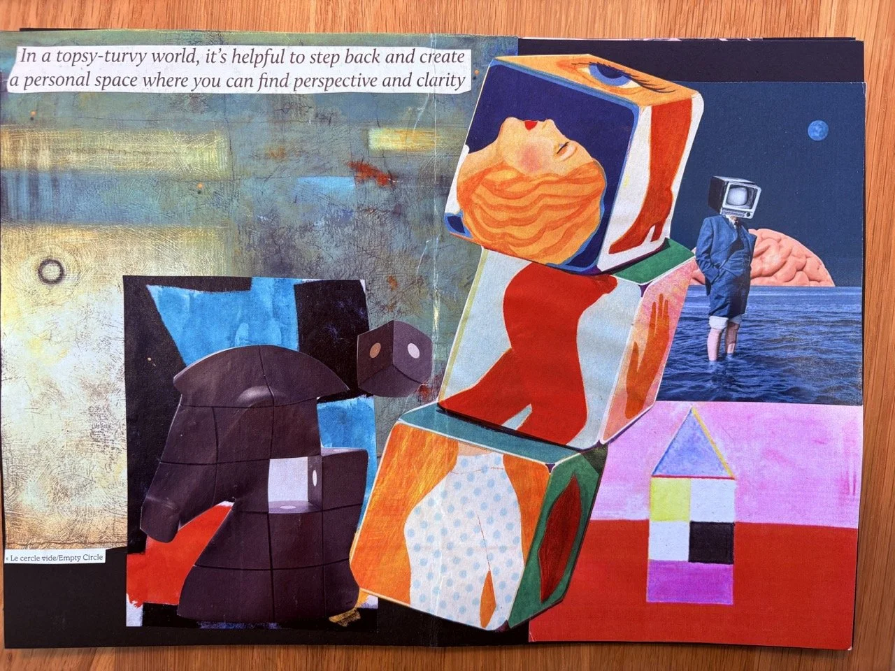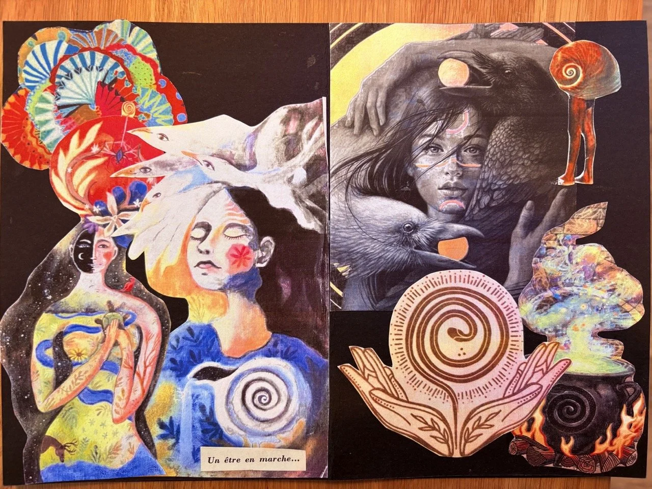Créer intuitivement : Dans un premier temps, laissez-vous guider par votre instinct et votre sensibilité. Par le collage, les couleurs et les traces, donnez forme à votre intuition sans attente ni jugement.