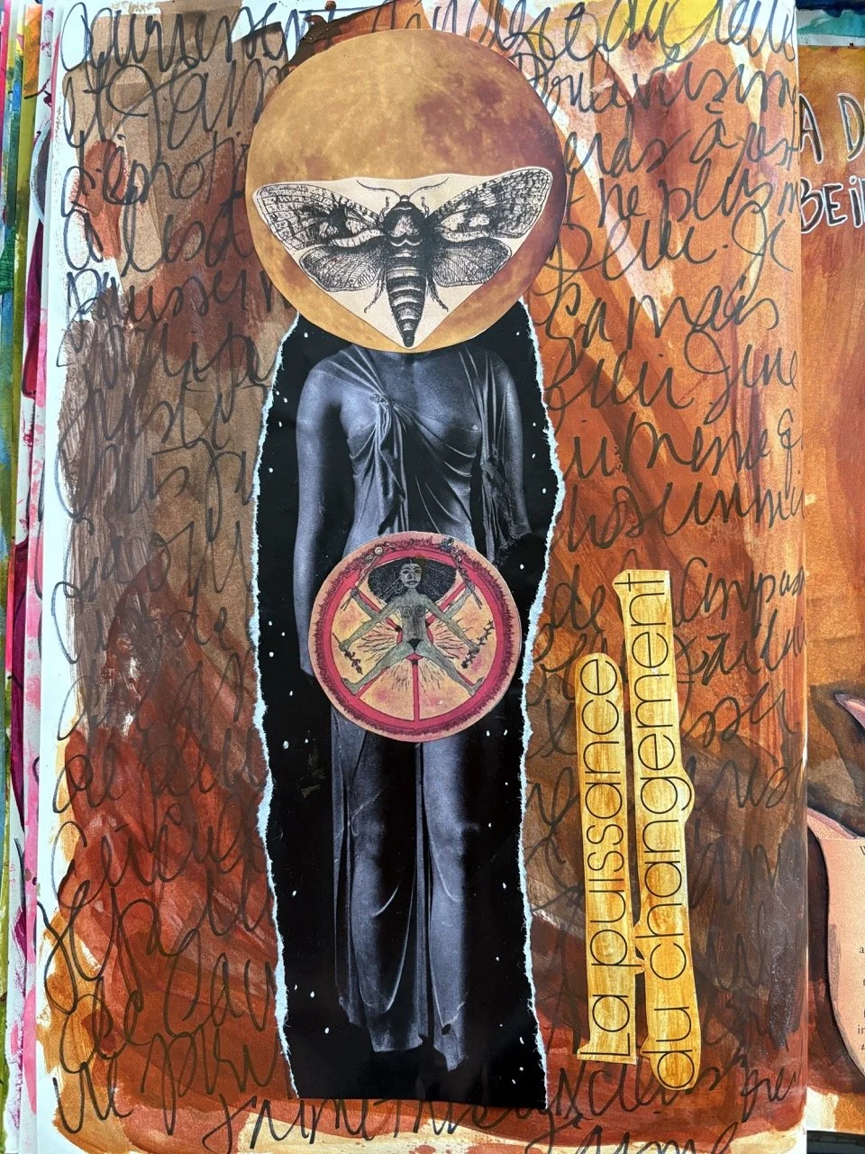 “J’ai regardé passer le train pendant de nombreuses saisons avant d’oser m’inscrire à un atelier. Puis, un jour j’ai plongé et très rapidement, j’ai réalisé le formidable cadeau que je venais de me faire. J’ai tout d’abord comblé ce désir de réactiver ma créativité et j’ai appris à me faire confiance et à faire des essais sans avoir d’attente. Au fil des ateliers, je suis allée à ma rencontre en explorant le pouvoir éclairant de l’écriture et des images. J’ai appris à faire confiance à mon intelligence silencieuse pour trouver mes réponses. Mon seul regret c’est de ne pas avoir osé m’inscrire plus tôt!”